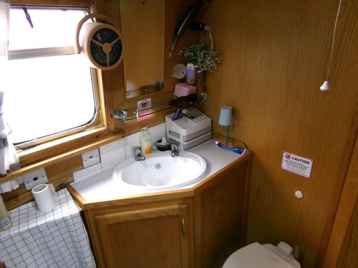 The bathroom is fitted with a good sized hip bath with shower overhead and shower curtain. There is also a vanity unit with washbasin, and a pump-out toilet.